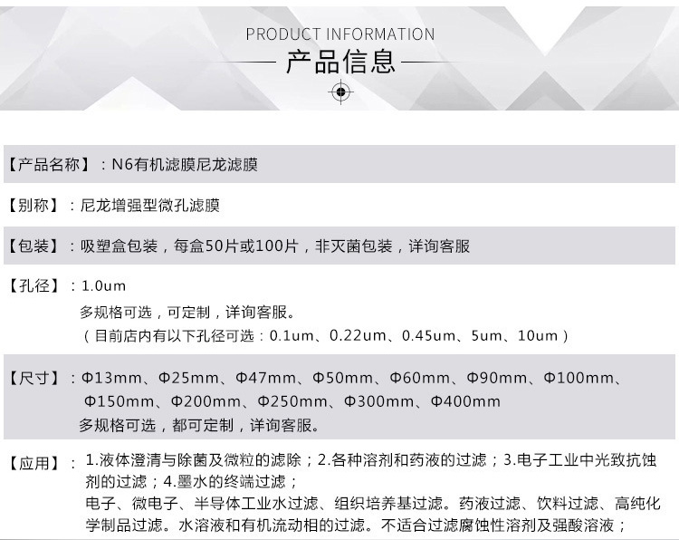 孔徑選用原則同混纖膜,即除微粒采用公稱孔徑um,除菌采用公稱孔徑0.65um、0.45um、0.3um、0.22um、0.1um,直徑:100mm、150mm、200mm、300mm、400mm。