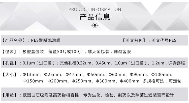 孔徑選用原則同混纖膜,即除微粒采用公稱孔徑um,除菌采用公稱孔徑0.65um、0.45um、0.3um、0.22um、0.1um,直徑:100mm、150mm、200mm、300mm、400mm。