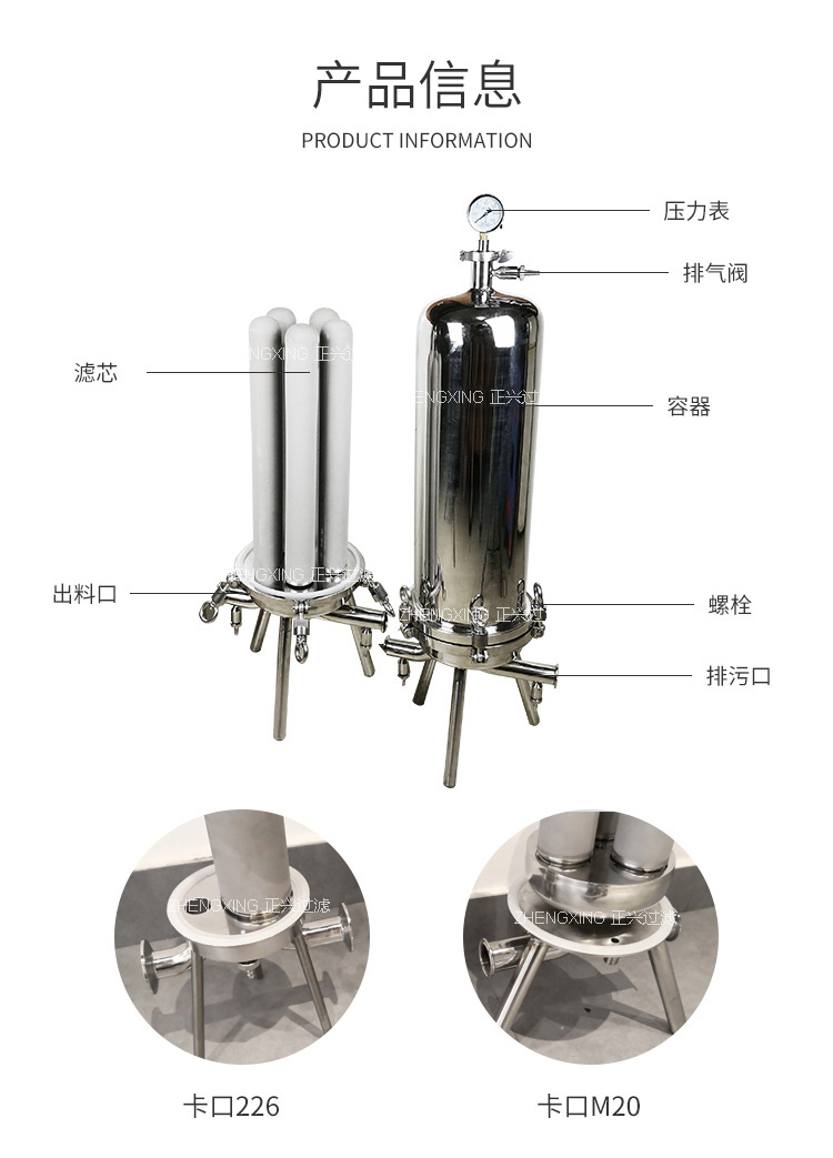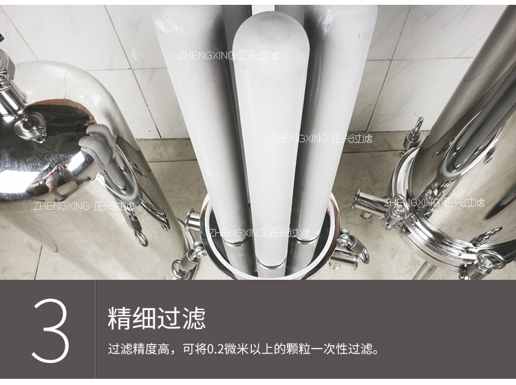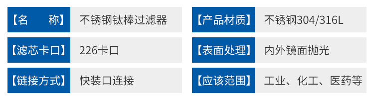 鈦棒過濾器采用 304或316L 不銹鋼材料作外殼,內部濾芯為鈦管,具有耐高溫、高壓、強酸、強堿、耐腐蝕,濾芯可反復再生使用等特點,是采用粉末冶金方法將鈦金屬粉末未通過高溫燒結的方法加工制成的空心濾管,它廣泛地應用于食品、飲料、醫藥、化工等行業的液固分離,在制藥行業尤其適用于大輸液和針劑生產線中的脫碳過濾。此系列產品具有結構緊湊造型美觀按 GMP 標準生產,管件連接采用國際標準快裝式連接,拆裝清洗方便。
