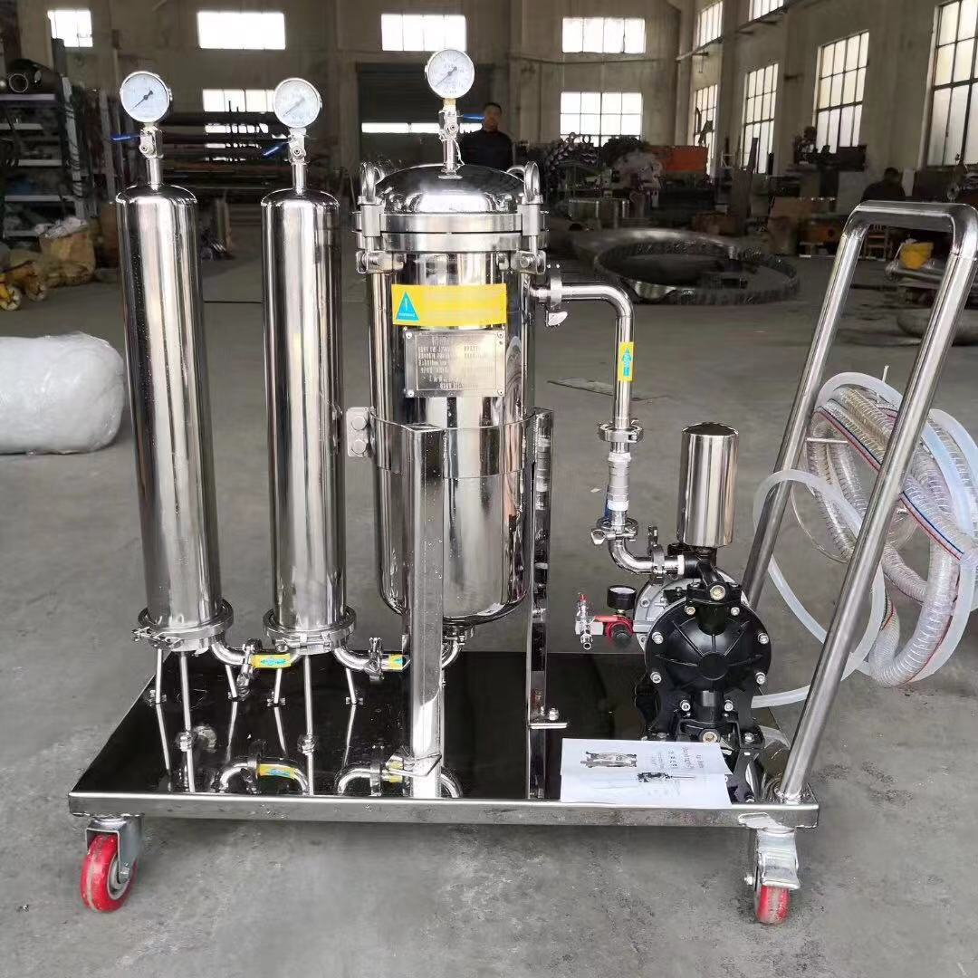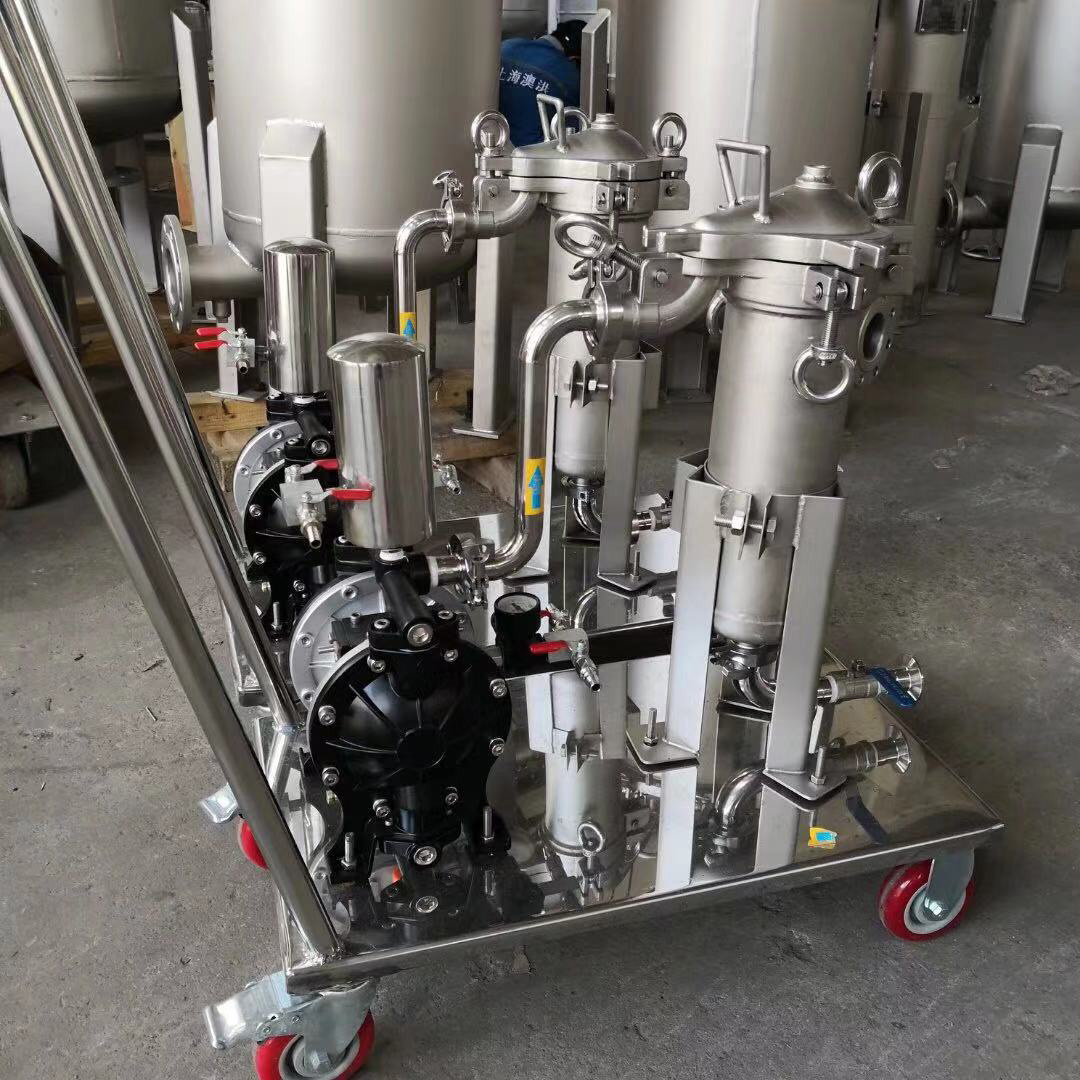 袋式過(guò)濾機(jī)是一種壓力式過(guò)濾裝置,主要有過(guò)濾筒體、過(guò)濾筒蓋和快開機(jī)構(gòu)、不銹鋼濾袋加強(qiáng)網(wǎng)等主要部件組成,濾液由過(guò)濾機(jī)外殼的旁側(cè)入口管流入濾袋,濾袋本身是裝置在加強(qiáng)網(wǎng)籃內(nèi),液體滲透過(guò)所需要細(xì)度等級(jí)的濾袋即能獲得合格的濾液,雜質(zhì)顆粒被濾袋攔截。該機(jī)更換濾袋十分方便,過(guò)濾基本無(wú)物料消耗。