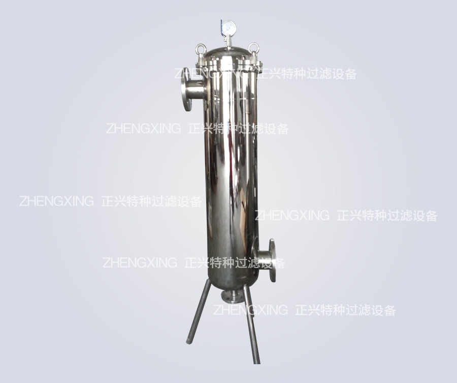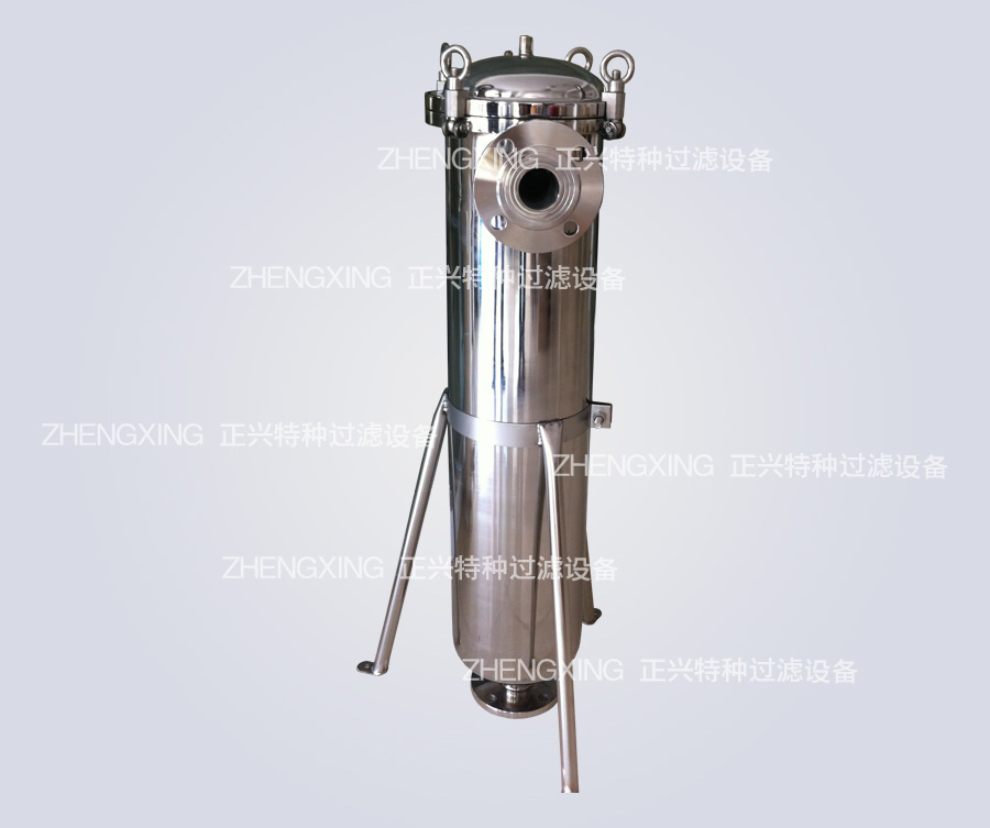 袋式過(guò)濾機(jī)是一種壓力式過(guò)濾裝置,主要有過(guò)濾筒體、過(guò)濾筒蓋和快開(kāi)機(jī)構(gòu)、不銹鋼濾袋加強(qiáng)網(wǎng)等主要部件組成,濾液由過(guò)濾機(jī)外殼的旁側(cè)入口管流入濾袋,濾袋本身是裝置在加強(qiáng)網(wǎng)籃內(nèi),液體滲透過(guò)所需要細(xì)度等級(jí)的濾袋即能獲得合格的濾液,雜質(zhì)顆粒被濾袋攔截。該機(jī)更換濾袋十分方便,過(guò)濾基本無(wú)物料消耗。