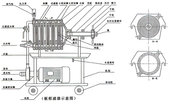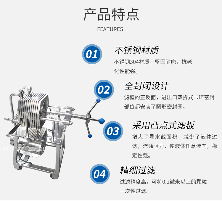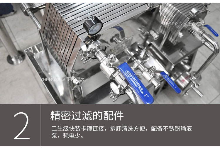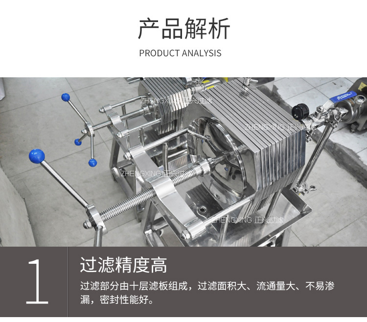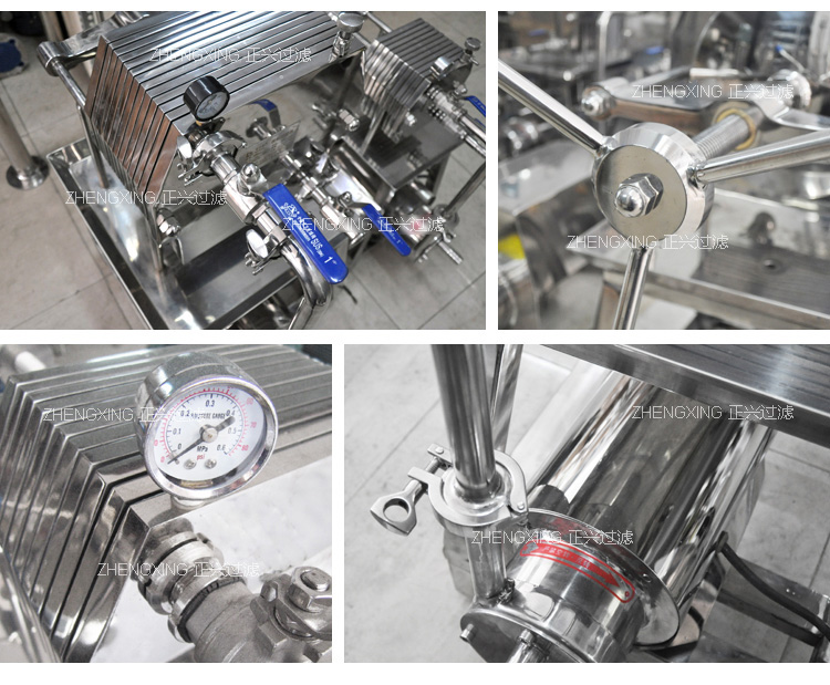 本機為不銹鋼多層板框壓濾機,適用于濃度50%以下粘度較低,含渣量較少的液體作密閉過濾以達到提純,滅菌、澄清等精濾、脫活性碳、除微粒、半精濾的要求,直接選用微孔濾膜,可不經微孔薄膜過濾器過濾可達到無菌過濾之目的)。本機過濾面積大,流量大,適用范圍大,所以在制藥、化工、食品等行業有廣泛用途,應用在制藥廠針劑藥液之過濾,效果甚佳。